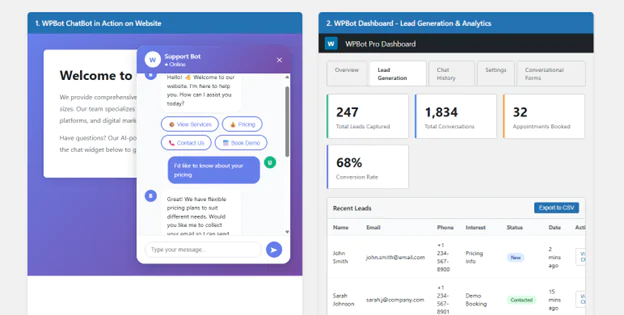 WPBot is a feature-rich chatbot plugin designed to handle lead generation, customer support, and interactive user engagement on WordPress sites. It allows businesses to provide automated assistance 24/7 without requiring coding skills. The plugin can manage bookings, answer FAQs, collect visitor data, and integrate with other AI tools, such as OpenAI or DialogFlow, for more advanced conversational experiences.